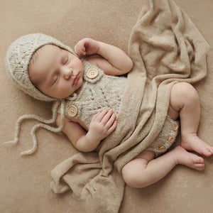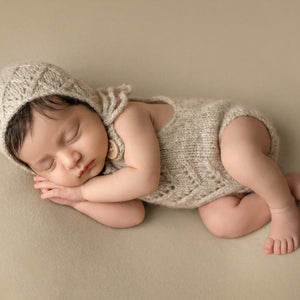 Our gorgeous Charlie Knit Romper & Bonnet Sets are the perfect addition to your newborn studios! Featuring a soft hand knitted romper and matching bonnet with ties, these sets are created using a faux-cashmere blended yarn with pretty vintage knit pattern. Available in three amazing shades.