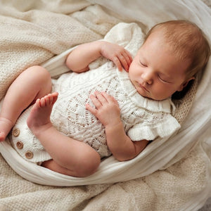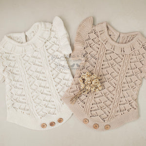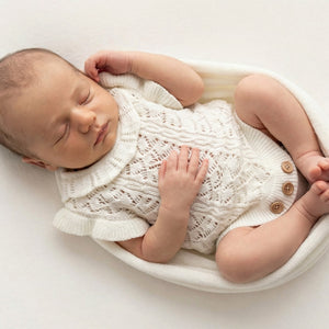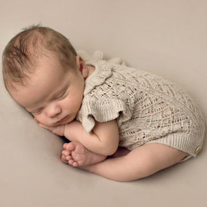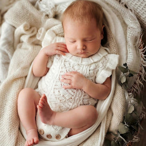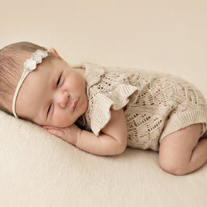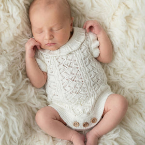 Our adorable Charlotte Knit Rompers feature a stunning embroidered pointelle design with pretty frilled shoulders and collar, with buttons at bottom and back for ease of use. Your clients are guaranteed to love this gorgeous design just as much as you do! Available in two amazing shades.