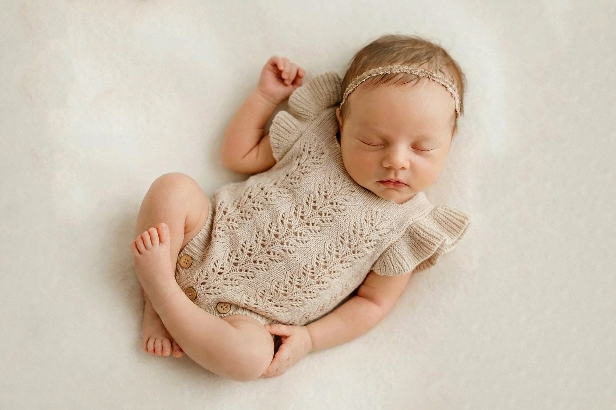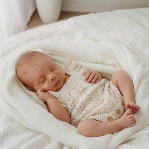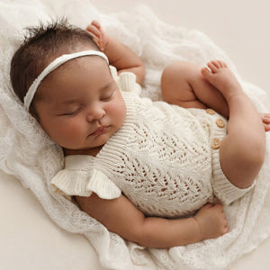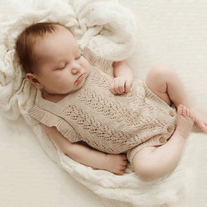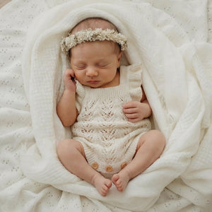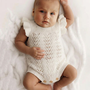 Our stunning Georgie Knit Rompers feature a gorgeous botanical pointelle design with pretty ruffled shoulders that criss-cross at the back. Faux wood buttons at bottom and two sets of adjutable buttons at back for ease of use. Available in two gorgeous shades!