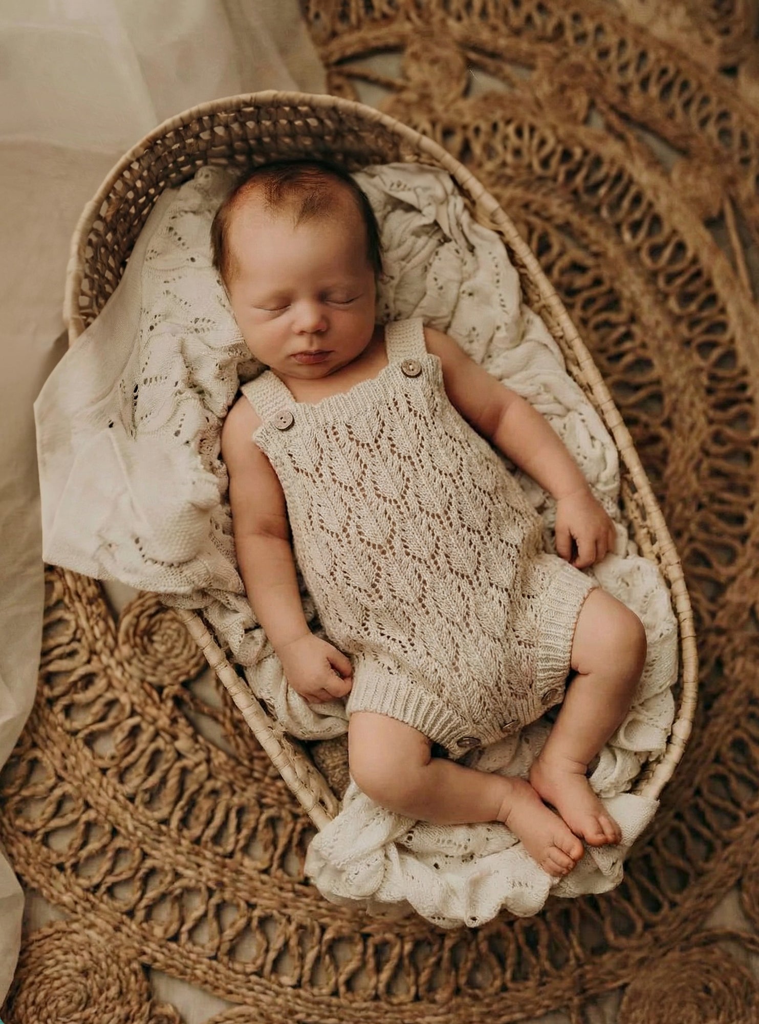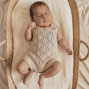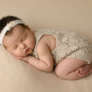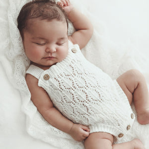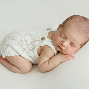 Our stunning Olivia Knit Rompers feature a beautiful floral embroidered pointelle design with shoulder straps and buttons at bottom for ease of use. Your clients are guaranteed to love this gorgeous design just as much as you do! Available in two amazing shades.
