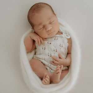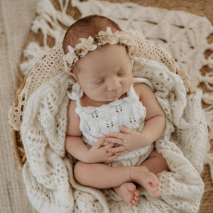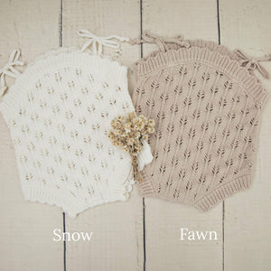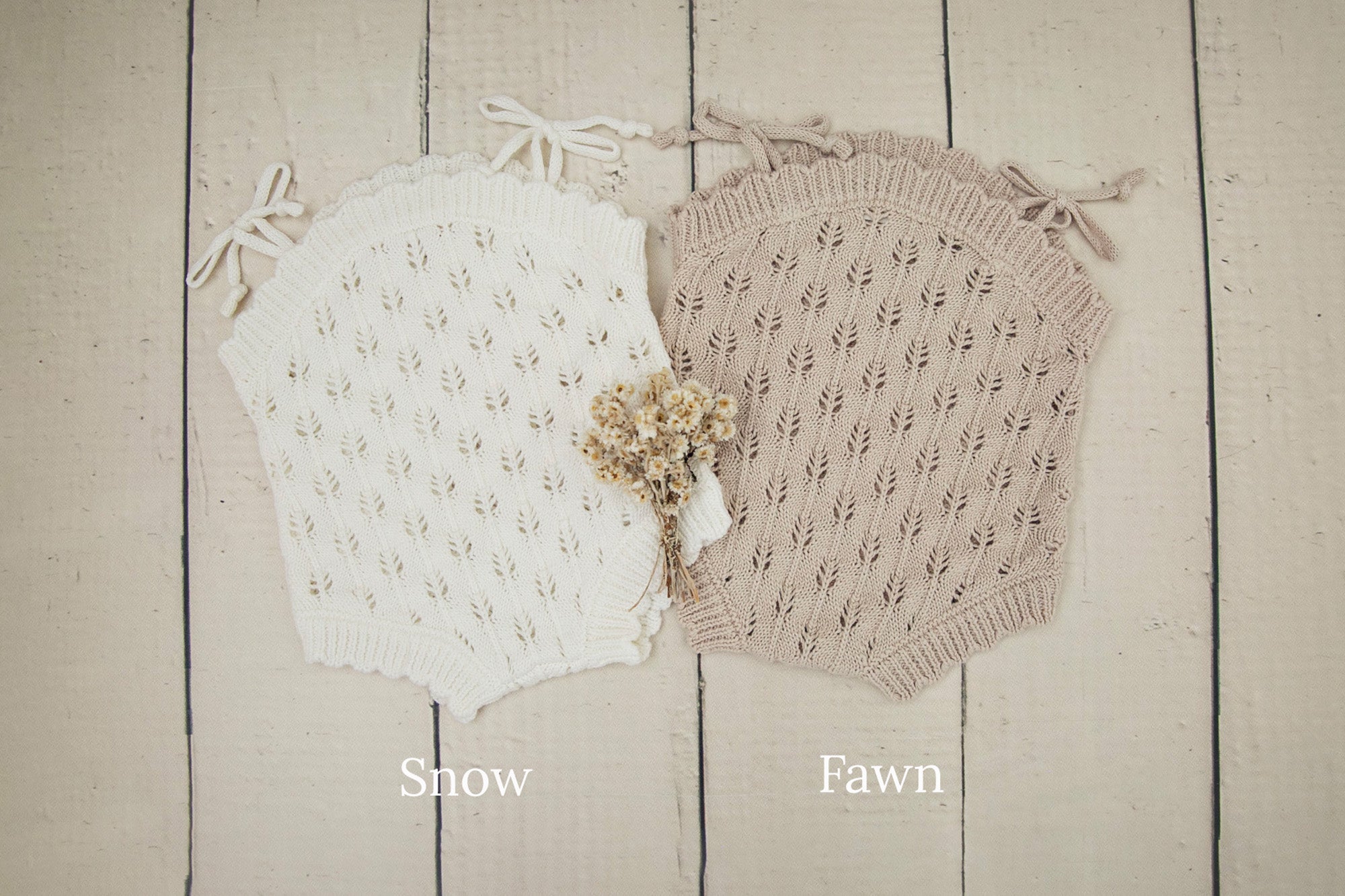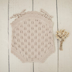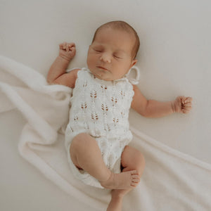 Our adorable Evie Knit Rompers feature a gorgeous embroidered botanical leaf pattern throughout with dainty tied shoulder straps. Available in two gorgeous shades!